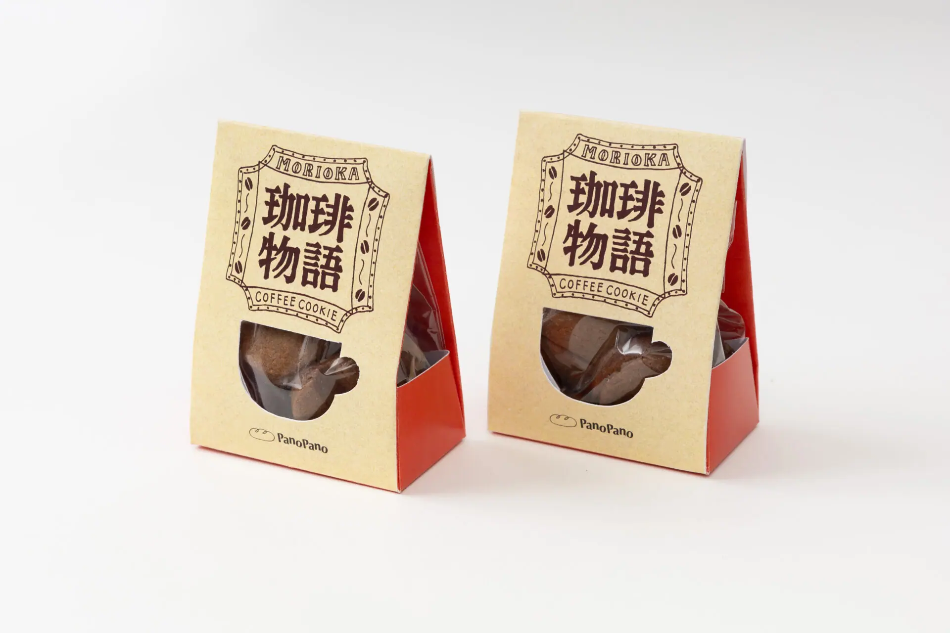 盛岡の珈琲文化を紐解いてみると、それぞれの店、一杯のコーヒーの背景には店の歴史や店主のこだわり、お客さんの思い出がたくさんあることがわかりました。そんなストーリーも伝えたくて「盛岡珈琲物語」と名付けました。コーヒーカップの形の窓から、かわいらしいコーヒー豆の形のクッキーがのぞくのがポイントです。手書きで表現することで、どこか懐かしく温かみを感じるデザインに仕上げました。