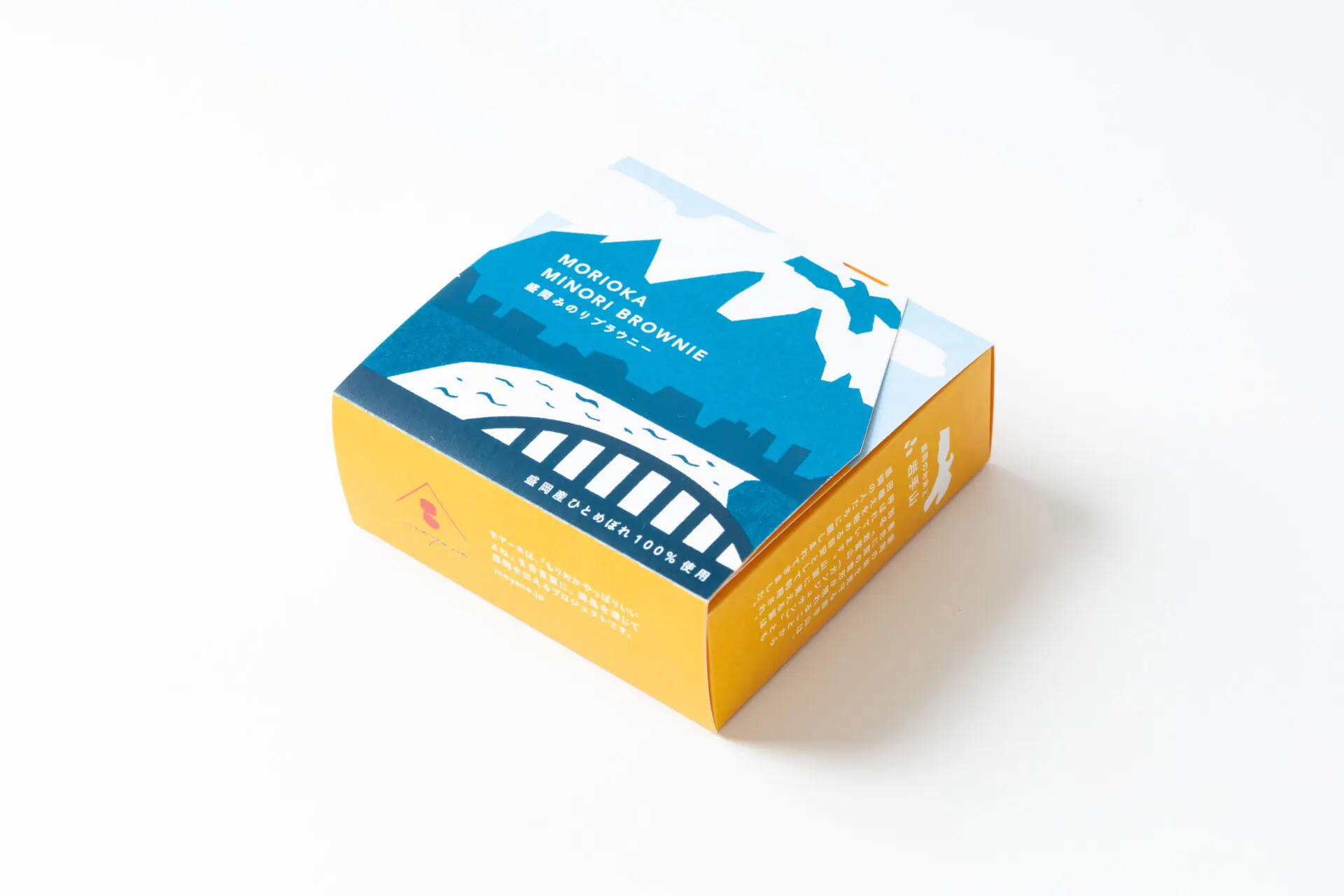 盛岡みのりブラウニーは、盛岡の景色を思い出したり、魅力を知ってもらえるようなデザインにしました。正面には北上川に架かる開運橋と雪が残る岩手山、蓋を開けると春から秋の季節に変わった黄金色の稲穂が広がります。田園風景は、米粉の生産場所である都南地区をイメージしていて、中心街近郊でも美味しいお米が届けられる盛岡を表現しています。景色を眺めたり、思い浮かべながらぜひお楽しみください。