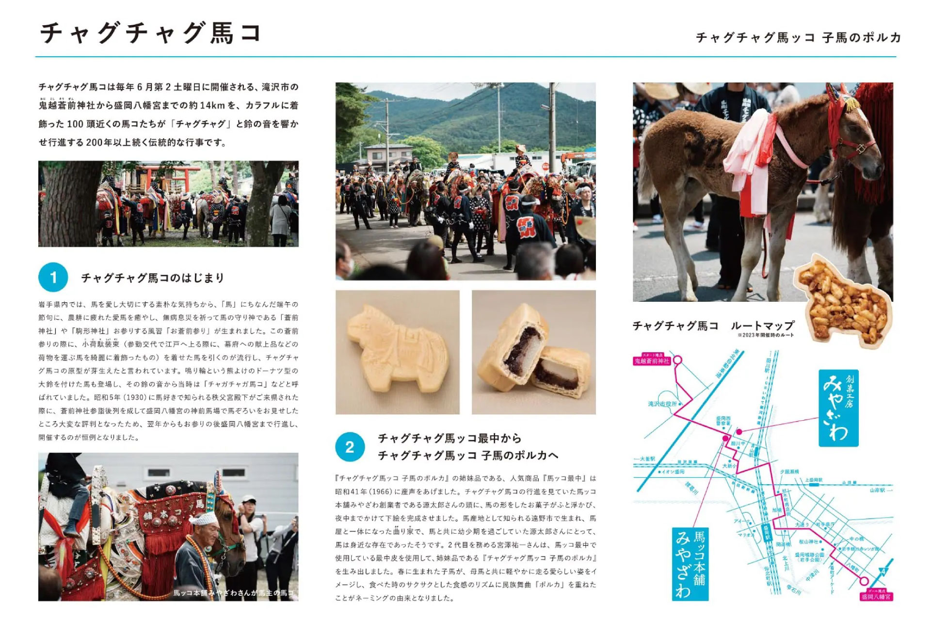 とてもかわいらしい見た目のお菓子なので、それを引き立てるような見せ方を心がけ、楽しくチャグチャグと歩く馬コをイメージしたデザインにしました。よりチャグチャグ馬コや子馬のポルカに愛着を持ってもらえるように、中の紙を開くとチャグチャグ馬コのルートマップとして使えるようにしたり、裏面にはチャグチャグ馬コの装飾品の紹介やポルカについての詩を掲載したりしています。