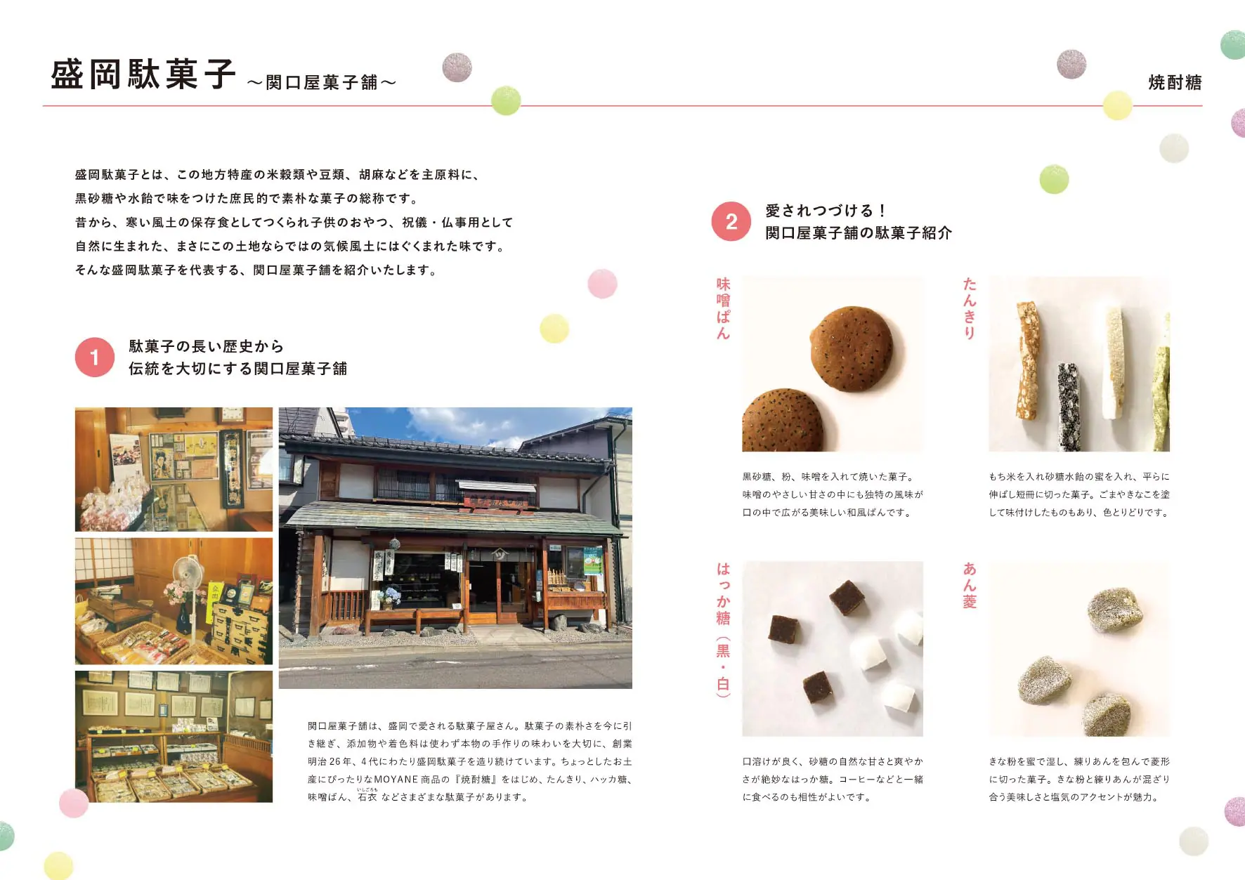本物の手作りの味わいを大切に、創業明治26年、4代に渡り盛岡駄菓子をつくり続けています。盛岡駄菓子とは、この地方特産の米穀類や豆類、胡麻などを主原料に、黒砂糖や水飴で味をつけた庶民的で素朴な菓子の総称です。昔から、寒い風土の保存食としてつくられ子供のおやつ、祝儀・仏事用として自然に生まれた、まさにこの土地ならではの気候風土にはぐくまれた味です。