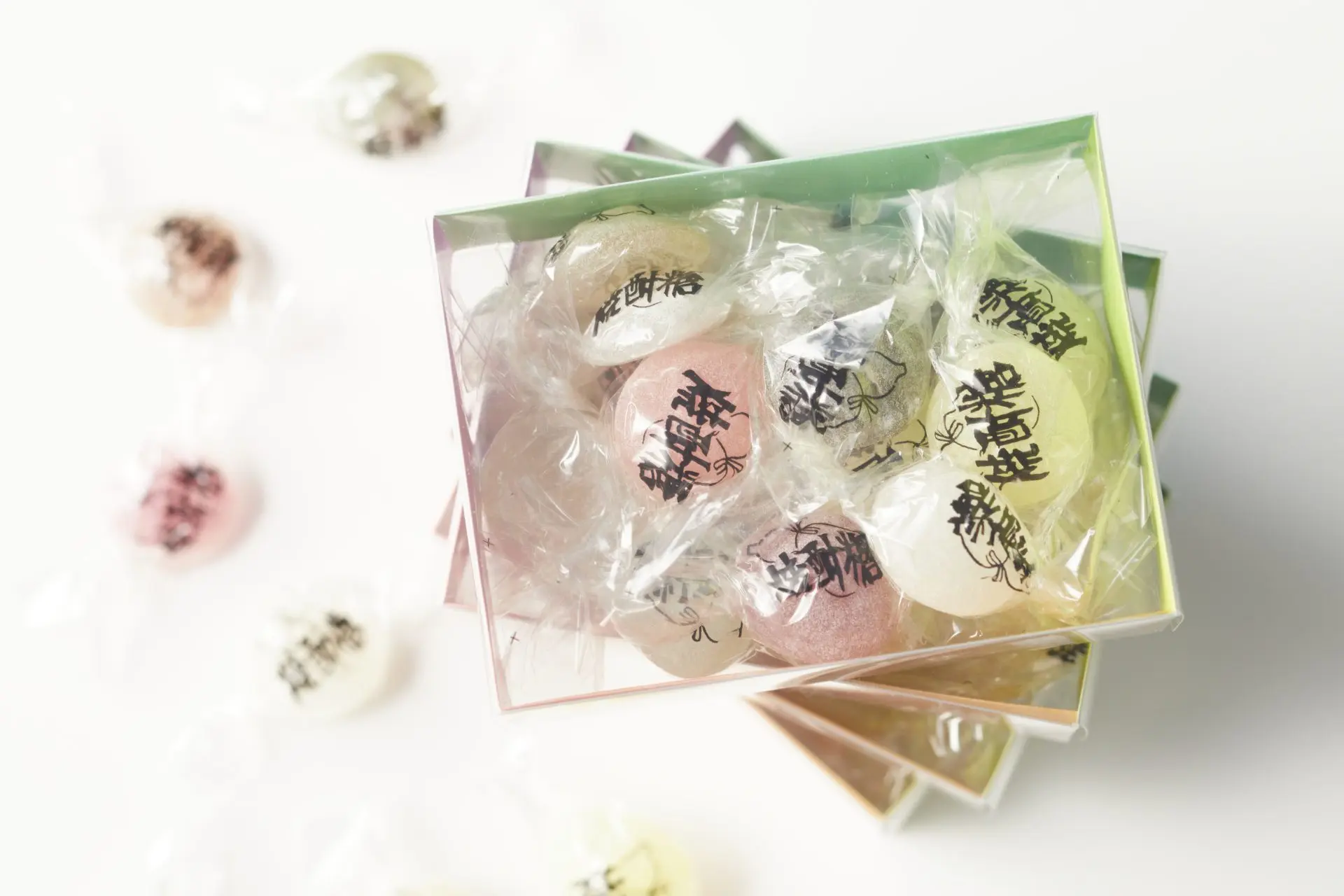 焼酎糖は形状や色合いが可愛らしく、既に盛岡で愛される商品であることから、焼酎糖の良さを最大限に生かしたパッケージを目指しました。混ざり合う焼酎シロップと砂糖を表現したグラデーションが、レトロでもあり、近未来性もある印象を与えます。 また、透明の箱を使用することで、焼酎糖の繊細さや造形美をそのまま見せるインパクトの強さがあります。まるで標本のような立体感と透明感がロマンチックでフォトジェニックです。