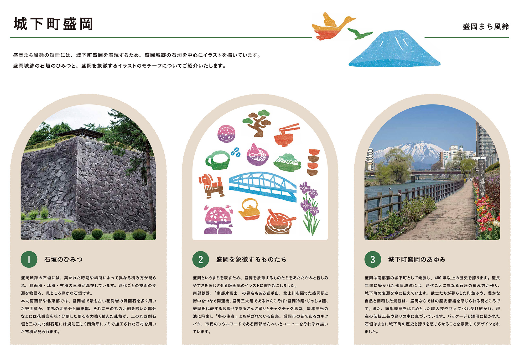 盛岡のお土産ということで、盛岡についてあらためて考えました。盛岡市の基礎となったのは盛岡城を中心としたその城下町です。盛岡の文化や自然などを石垣と一緒にイラストにすることで盛岡そのものを表現し短冊にデザインしました。また、盛岡城は段階を経て大きくなっていった歴史があり、石垣の積み方が時代ごとに変化しています。それによって積み方の違う石垣が同じ場所に混在してるという特徴が岩手公園にはあり、風鈴を入れる箱には、側面ごとに積み方の違う石垣をデザインしてその特徴を活かすことにしました。